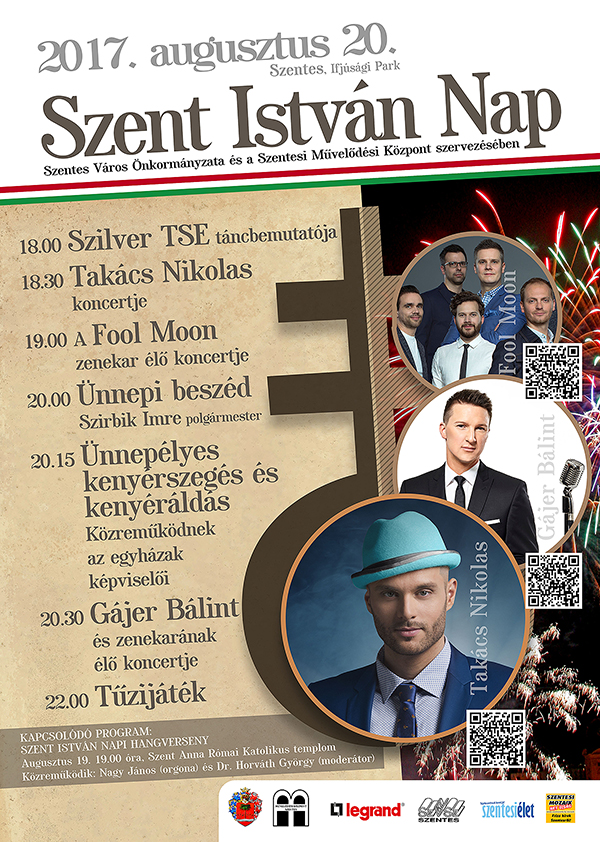 2017. Augusztus 20-án Szent István Napján három előadónak koncertjét hallhatjuk a Művelődési és Ifjúsági Ház szabadtéri színpadán. A Szilver TSE táncosai után Takács Nikolas lép a színpadra. Őt követi a Fool Moon zenekar elő koncertje. Az a'cappella (hangszerkíséret nélküli többszólamú kórusmű előadásmódját nevezik így) együttes igazi kuriózum a zenei palettán, melyre érdemes kilátogatni. Ezután következik az ünnepi megemlékezés, és kenyéráldás, és végül Gájer Bálint élő koncertje lesz és tűzijáték zárja az estét 22.00 órakor.
