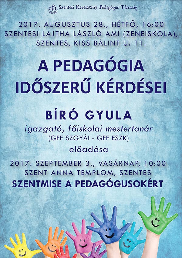 2017. augusztus 28-án 16.00 órai kezdettel A pedagógia időszerű kérdései címmel hallhatják Bíró Gyula főiskolai mestertanár (GFF SZGYÁI - GFF ESZK) előadását a Lajtha László AMI nagytermében.