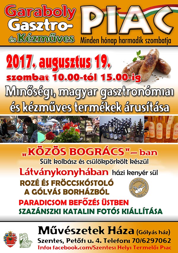 Ha 3. szombat, akkor Gasztro Piac. Jelszavunk most is: "Egyél jót, vegyél hazait!" A nyár utolsó piacán, augusztus 19-én friss zöldségekkel, termelői sajtokkal, gyümölcslevekkel, biotermékekkel, egyedi kézműves tárgyakkal és kiegészítő programokkal várjuk az érdeklődőket. Az új kenyér ünnepén is a kenyeret a Szabó Malom kiváló minőségű, adalékanyag-mentes lisztjéből sütjük.