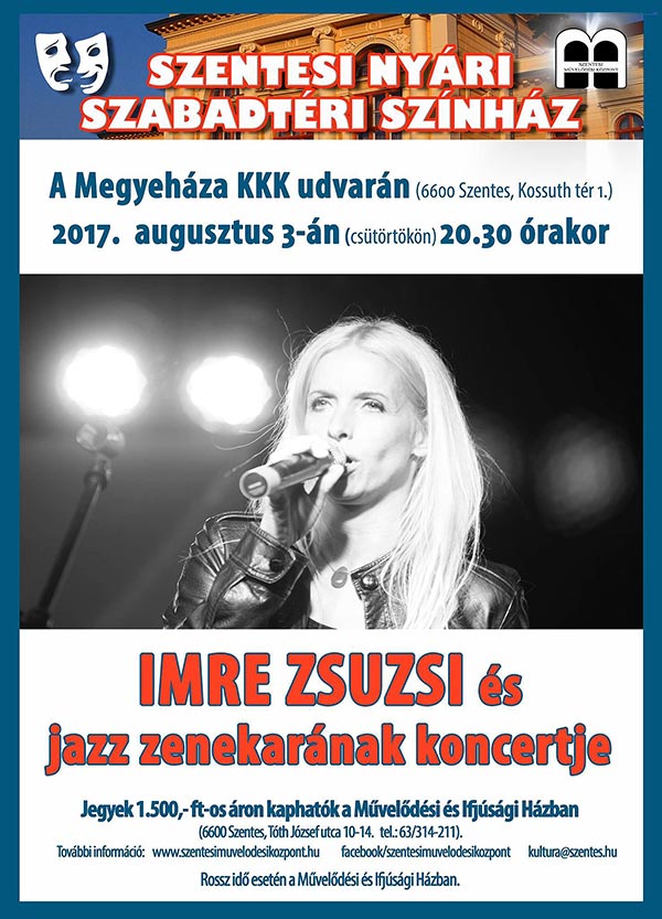 Augusztus 3-án, csütörtök este IMRE ZSUZSI koncert lesz a Megyeháza udvarán a Szentesi Nyári Szabadtéri Színházban! Jegyek 1.500,- ft-os áron már kaphatók a Művelődési és Ifjúsági Ház (Tóth József utca 10-14.) portáján munkanapokon reggel 8-tól este 18 óráig!