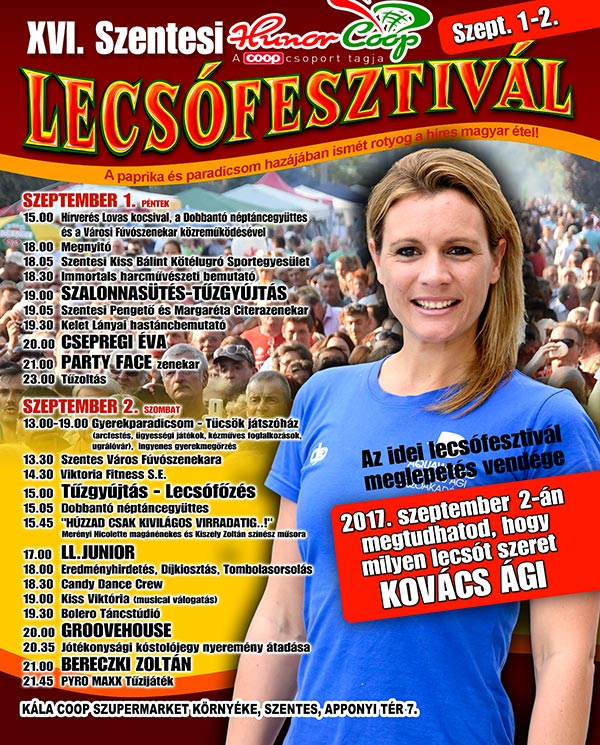 Idén szeptember elsején és másodikán ismét megrendezik Szentesen a mára már hagyományossá vált Lecsófesztivált. Az ezúttal 16. alkalommal megrendezett gasztroünnepen a tradicionális lecsó számtalan típusa mellett kulturális és zenei programok is várják az érdeklődőket. Az ez évi megmérettetésen ismét jelen lesznek olimpikonok, így zsűrizni fog Kovács Ági olimpiai bajnok úszó, Kammerer Zoltán, háromszoros olimpiai bajnok kajakozó és egy olimpikon legenda, Wichmann Tamás, kétszeres olimpiai ezüstérmes, kilencszeres világbajnok kenus, illetve az Update Lecsó képviselője Schobert Norbert.