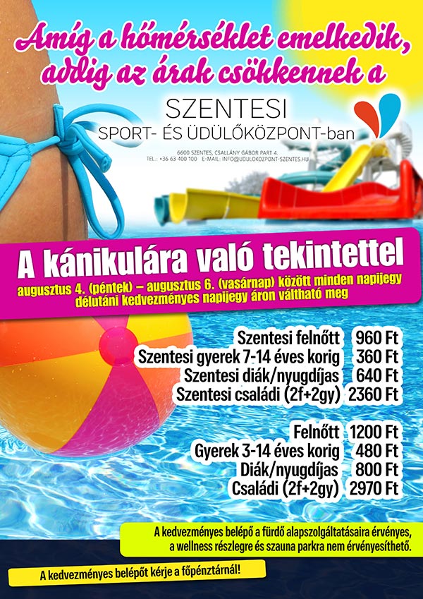 A kánikulára való tekintettel augusztus 4. (péntek) – augusztus 6. (vasárnap) között minden napijegy délutáni kedvezményes napijegy áron váltható meg a Szentesi Sport- és Üdülőközpontban!
