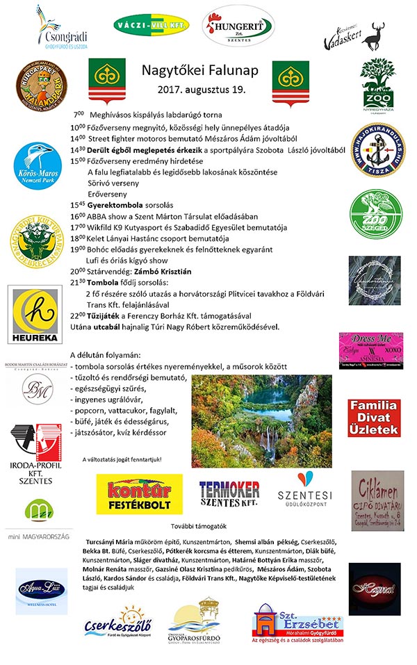 Jövő hétvégén rendezik meg a falunapot Nagytőkén, melynek keretében adják át a közösségi helyet. Igen színes programot sikerül összeállítani a szervezőknek a megannyi támogatónak köszönhetően. Aki teheti látogasson el a rendezvényre, melynek részletes programját a plakáton tekinthetik meg!