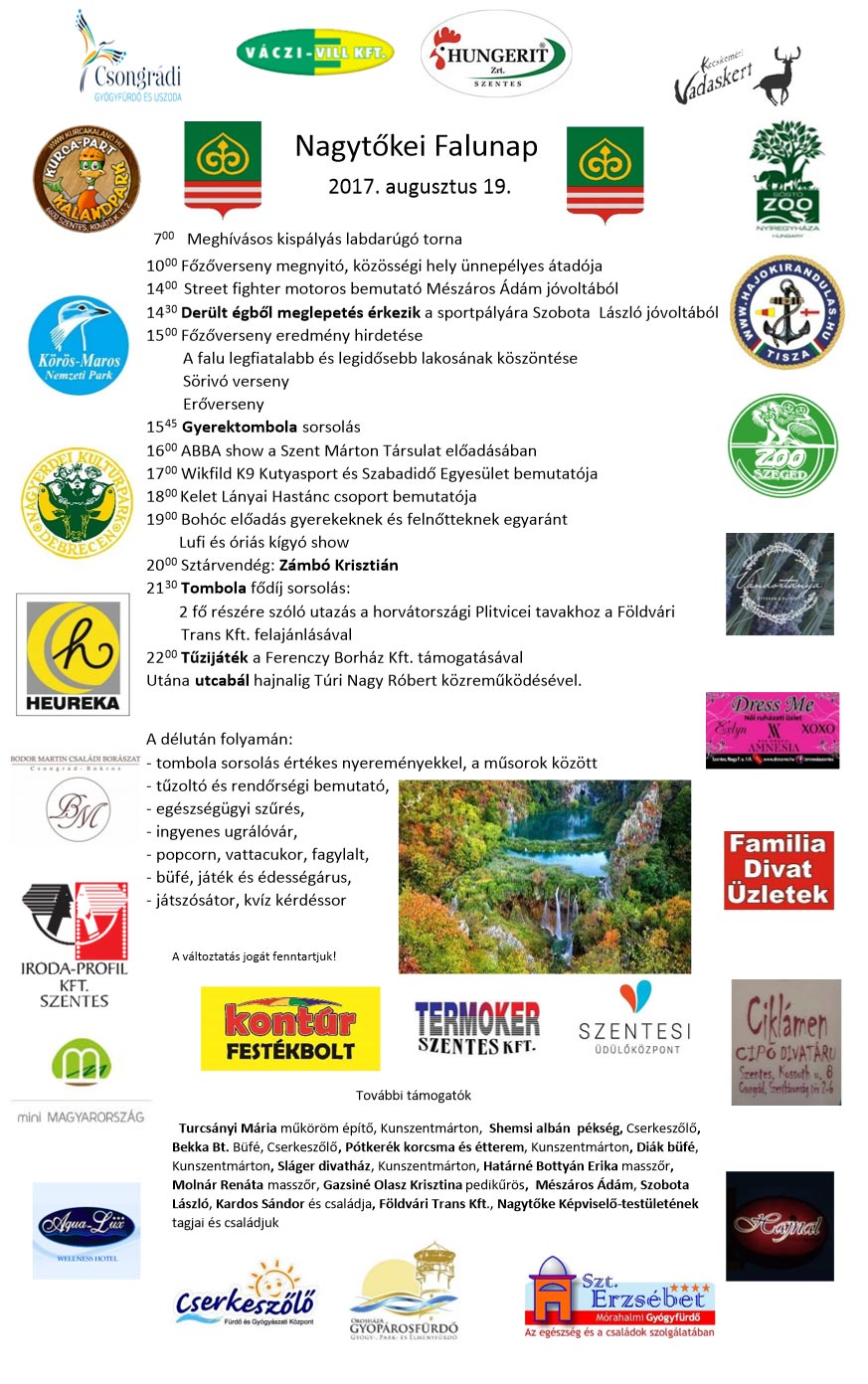 Jövő hétvégén rendezik meg a falunapot Nagytőkén, melynek keretében adják át a közösségi helyet. Igen színes programot sikerül összeállítani a szervezőknek a megannyi támogatónak köszönhetően. Aki teheti látogasson el a rendezvényre, melynek részletes programját a plakáton tekinthetik meg!