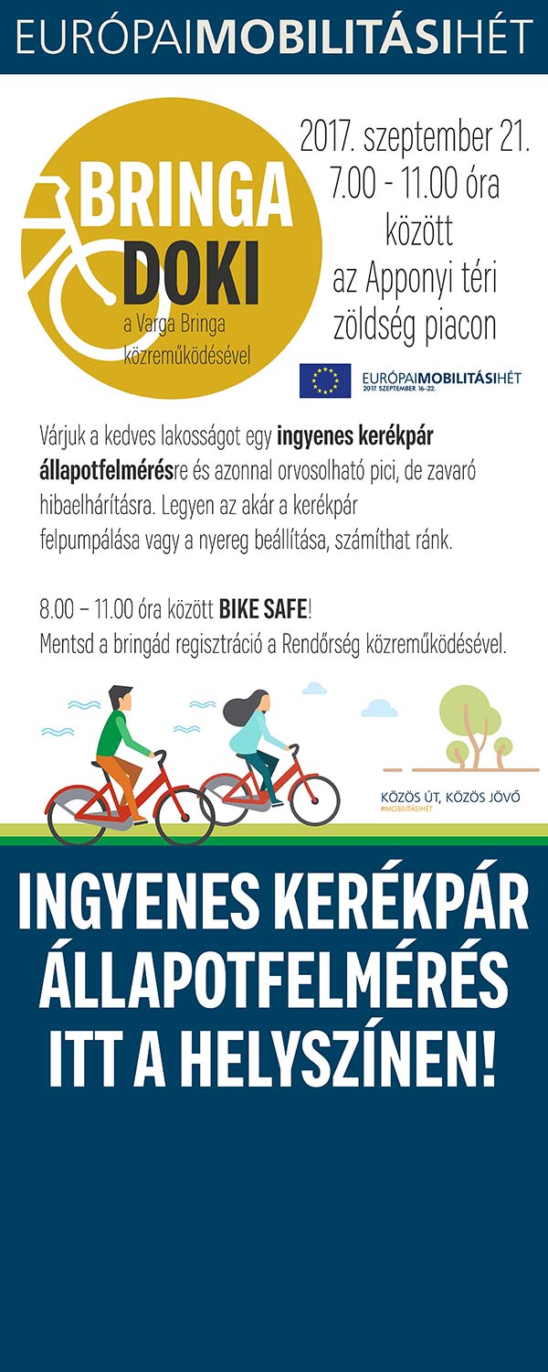 Az Európai Mobilitási Hét keretében 2017. szeptember 21-én BRINGA DOKI várja a pácienseket az Apponyi téri piacra, ahol kisebb javításokat elvégez. Legyen az akár a kerékpár felpumpálása vagy a nyereg beállítása, számíthat rá. Ezzel párhuzamosan a Szentesi Rendőrkapitányság a BIKESAFE kerékpár-regisztrációs programja is ott lesz a BRINGA DOKI mellett.