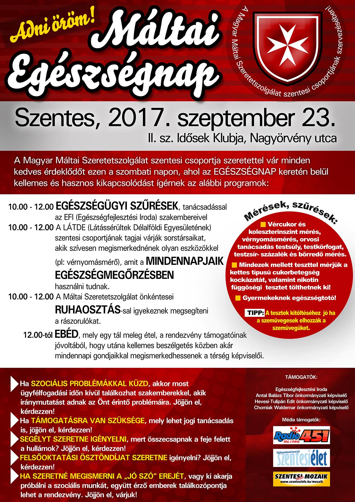 Immár második alkalommal szervez egészségnapot a Magyar Máltai Szeretetszolgálat Szentesi Csoportja, 2017. szeptember 23-án 10 órától. A helyszín új, a II. számú Idősek Klubjába várják a látogatókat a Nagyörvény u. 53. szám alatt. Idén is az egészségmegőrzésen lesz a hangsúly, ebédre pedig egy kiadós babgulyást kínálnak. További részleteket a hétvégén megjelent Szentesi Életben olvashatnak.
