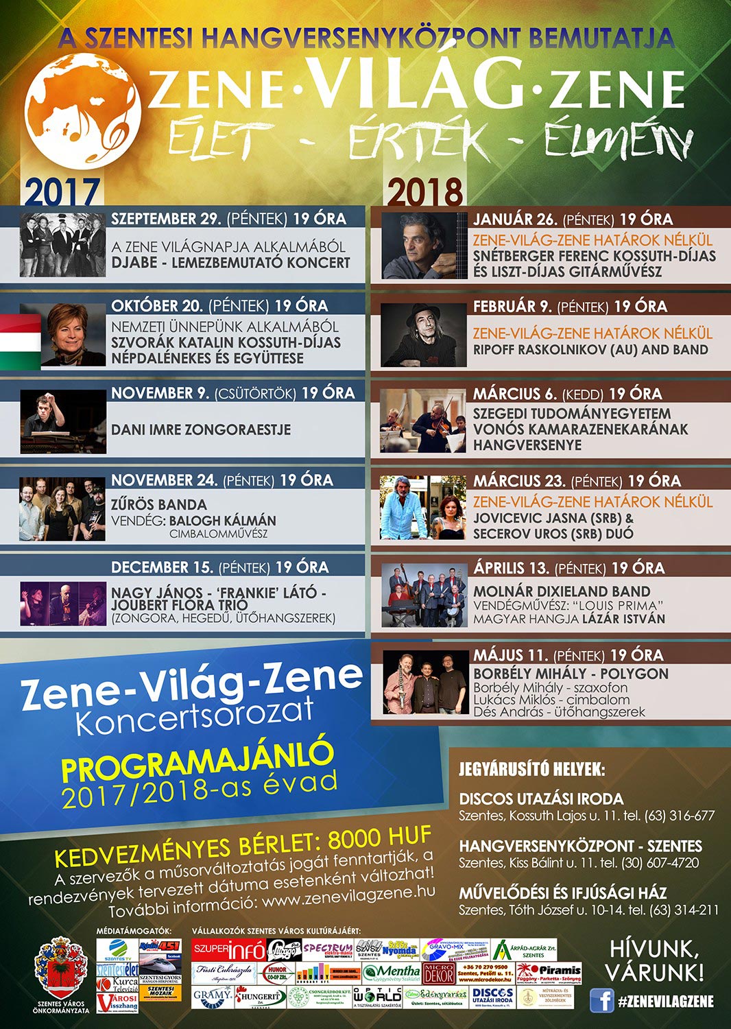 Indul a 2017/2018-as zenei évad Szentesen Élet - Érték - Élmény 2017. szeptember 29-én indul a 2017/2018-as zenei évad a Hangversenyközpontban. A tizenegy koncertből álló évad valamennyi programját kedvezményes bérlettel tekintheti meg, mely zenei csemegéket is tartalmaz. Bővebb információ a plakáton!