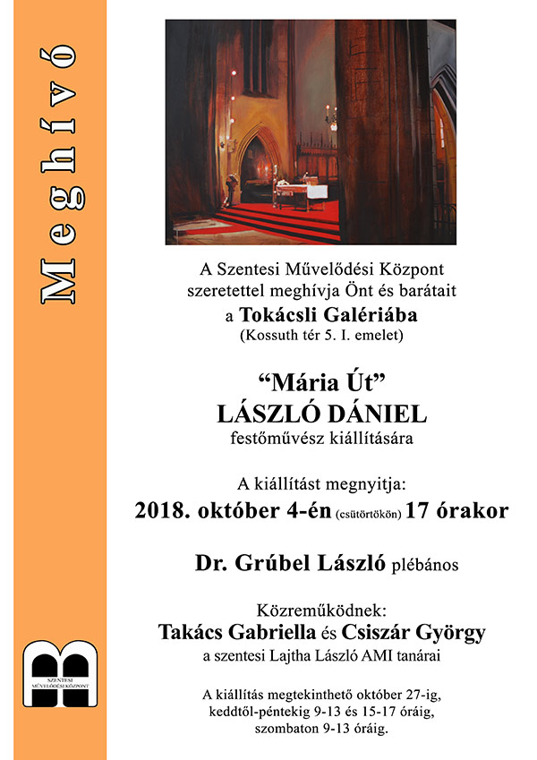Mária Út László Dániel festőművész kiállítása A Szentesi Művelődési Központ szeretettel meghívja Önt és barátait a Tokácsli Galériába (Kossuth tér 5. I. emelet) "Mária Út" LÁSZLÓ DÁNIEL festőművész kiállítására. A kiállítást megnyitja: 2018. október 4-én (csütörtökön) 17 órakor Dr. Grúbel László plébános Közreműködnek: Takács Gabriella és Csiszár György a szentesi Lajtha László AMI tanárai A kiállítás megtekinthető október 27-ig, keddtől-péntekig 9-13 és 15-17 óráig, szombaton 9-13 óráig.
