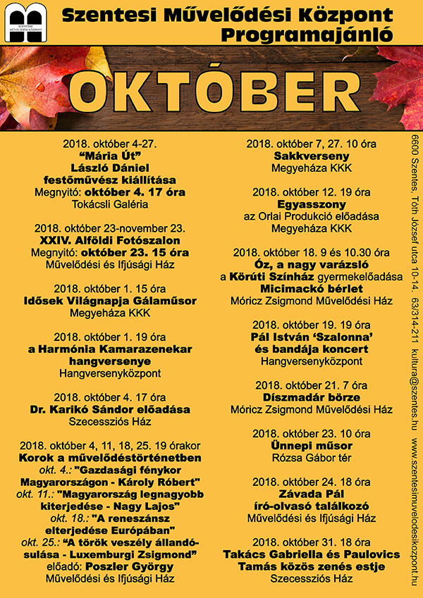 Októberi programajánló A Szentesi Művelődési Központ az alábbi programokat ajánlja a nagyközönségnek!