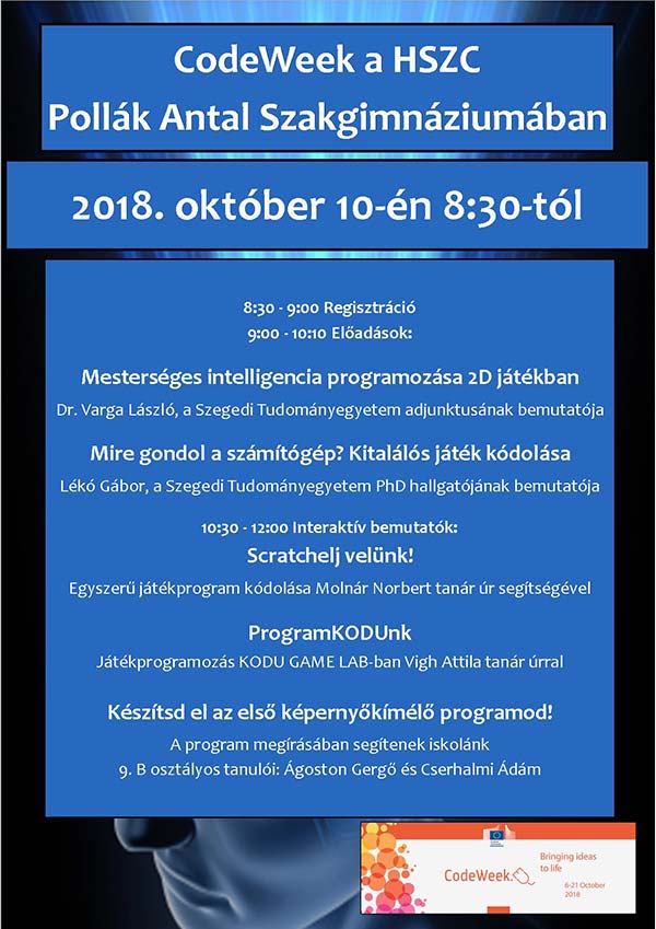 CodeWeek a Pollákban 2018. 2018. október 10-én egy délelőtti programmal csatlakozott a HSZC Pollák Antal Szakképző Iskolája az EU tagállamokban immár hatodik alkalommal megrendezett CodeWeek rendezvénysorozathoz. A rendezvénysorozat arra irányul, hogy közelebb hozza a programozást az emberekhez: így a diákokhoz, tanárokhoz, szülőkhöz is, és megmutassa, mindenki tud programozni, a programozás mindenki számára lehet élmény. A program egyik kiemelt célja, hogy a diákok megértsék, az informatikai életpálya számukra is elérhető, sokkal szélesebb és sokrétűbb lehetőség, mint azt általában gondolják.