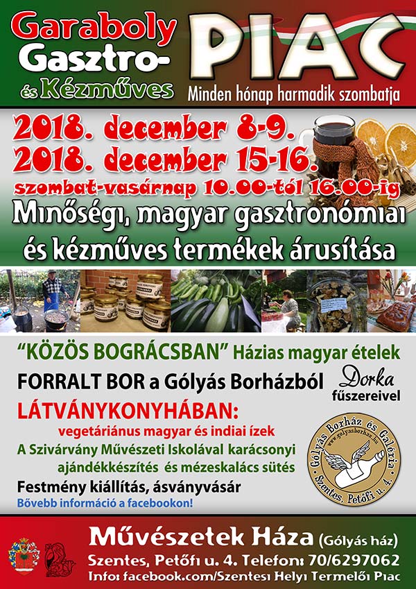 GASZTRO PIAC a minőségi, magyar termelői élelmiszerek és kézműves szépségek lelőhelye az adventi időszakban is. A Művészetek Házának hagyománya szerint decemberben négy napon várják törzsvevőket, a hazalátogató elszármazott szentesieket, a városba látogatókat és mindenkit, aki értékeli a jót és a minőséget.