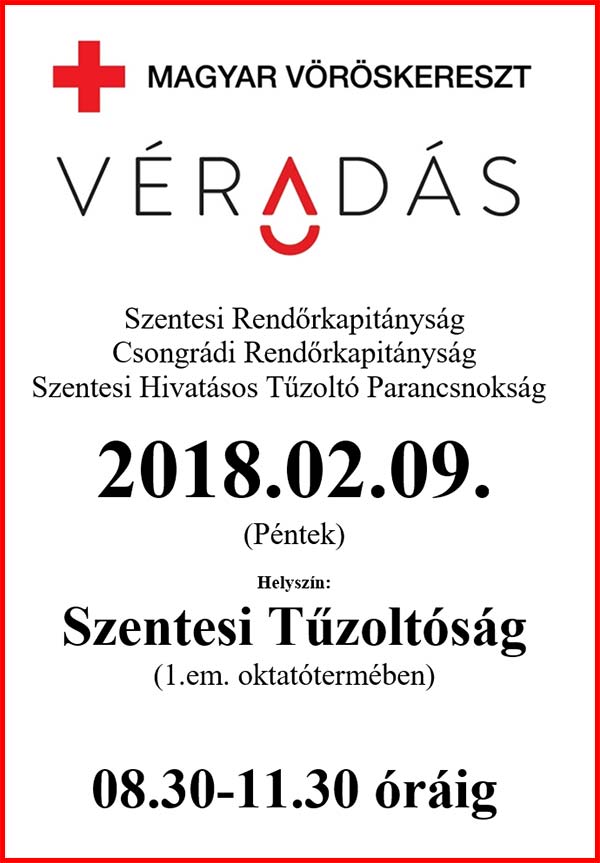2018.február 9-én (pénteken) véradást tart a Szentesi Tűzoltóság 1.em.