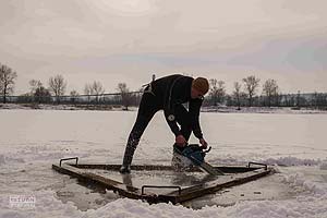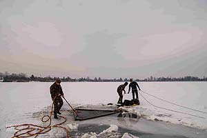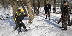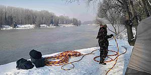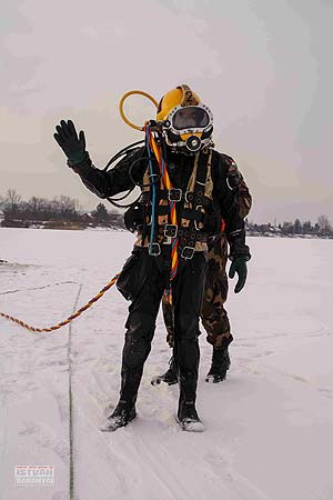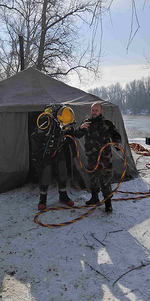A sisakos búvárfelkészítésen a műszaki ezred katonái mellett részt vettek még az MH 1. Honvéd Tűzszerész és Hadihajós Ezred búvárai is, akik az első hét védett vízi merülései után a szentesi tiszai gyakorlótéren, valamint a Mályi-tóban gyakorolták be a víz alatti búvárfelszerelések és eszközök használatát. Különösen bonyolulttá tette a búvárok feladatát, hogy idén először ezt a tevékenységet jég alatt kellett elvégezniük. A felszíni szolgálat, vagyis a külső segítők feladata sem volt egyszerű. A változékony időjárási viszonyok miatt egy hét alatt három léket is kellett vágniuk, továbbá biztosítaniuk kellett az olvadó jég fölött a hidraulikus eszközök működését is. kép: Baranyai István őrnagy szöveg: Csordásné Nehéz Zsuzsanna százados