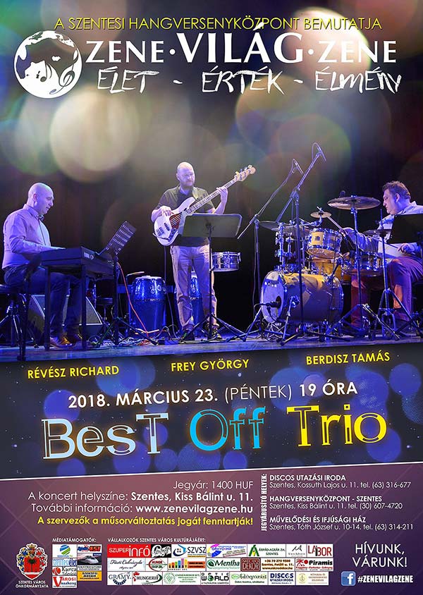 BesT Off Trio Zene-Világ-Zene koncertsorozatban 2018. március 23. pénteken 19 órai kezdettel a BesT Off Trio koncertjét hallgathatjuk a Hangversenyközpont soron következő műsorában.