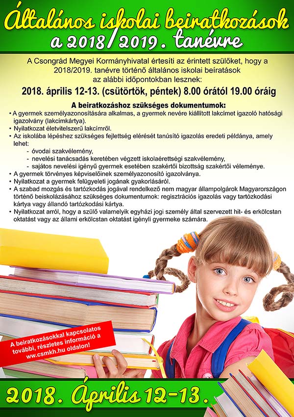 Általános iskolai beiratkozások A Csongrád Megyei Kormányhivatal értesíti az érintett szülőket, hogy a 2018/2019. tanévre történő általános iskolai beíratások az alábbi időpontokban lesznek: 2018. április 12-13. (csütörtök, péntek) 8.00 órától 19.00 óráig