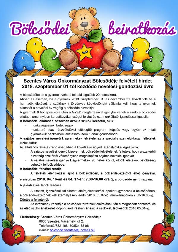 Bölcsődei beiratkozás Szentes Város Önkormányzat Bölcsődéje felvételt hirdet 2018. szeptember 01-től kezdődő nevelési-gondozási évre A bölcsődei felvétel rendje A felvételi jelentkezési lapot a bölcsődében, a bölcsődevezetőtől lehet igényelni, elsősorban 2018. 04. 16-án és 04. 17-én: 7.30-16.00 óráig, a bölcsőde nyílt napjain. A jelentkezési lapok leadása: A kitöltött, igazolásokkal ellátott, aláírt jelentkezési lapokat ugyancsak a bölcsődében, a bölcsődevezetőnek kell személyesen leadni 2018. 05.07-ig, munkanapokon 7.30-16.00-ig. Döntés a felvételről: Az intézmény vezetője a bölcsődei felvételek elbírálása után a meghozott döntésről és az első szülői értekezlet időpontjáról írásban értesíti a szülőket, legkésőbb 2018.05.31-ig.