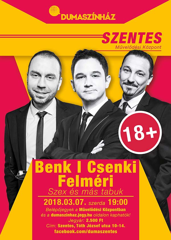 Ismételten Dumaszínház Szentesen Benk, Csenki és Felméri - ez a három név ismert a Dumaszínház látogatók között. 2018. március 7-én szerdán 19 órai kezdettel nem másról mesélnek Szentesen, mint a szexről és más tabukról. Bővebb információ a plakáton!