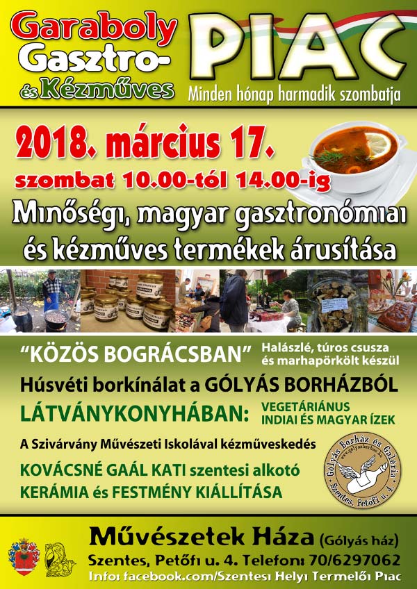 Márciusi gasztro piac a húsvét jegyében A márciusi gasztro piac a tavasz és a húsvét jegyében zajlik. Édes szépségek: MÉZESKALÁCS álmok húsvétra is Paksi Gabitól. A legjobb ünnepi borok a család asztalára a Gólyás Borháztól. Piacmenü magyaros klasszikusokkal - halászlé, túrós csusza, marhapörkölt. Most is lesz művészeti kiállítás: KOVÁCSNÉ GAÁL KATI kerámiáiból és festményeiből.