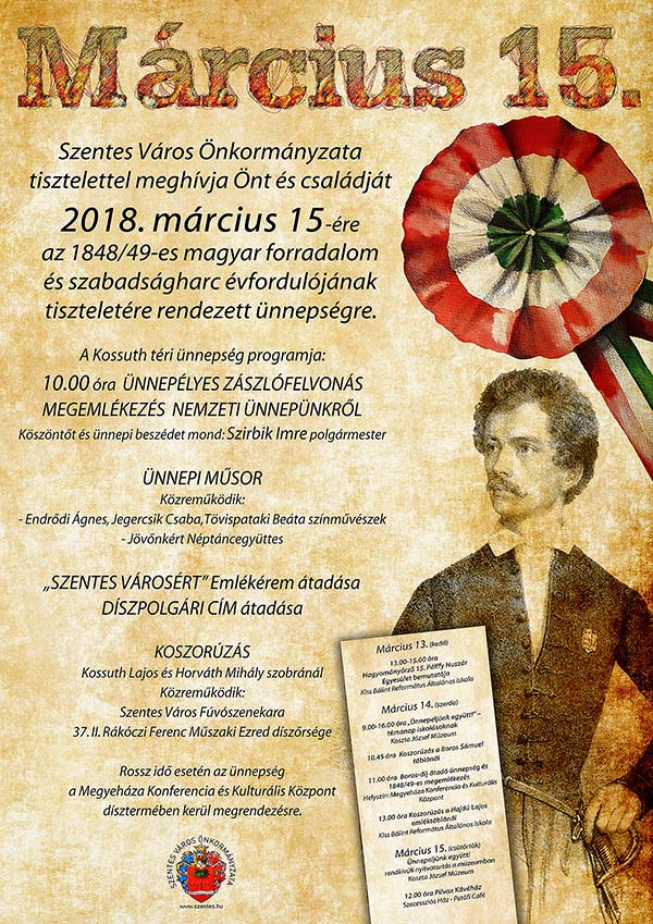 Március 15. Szentes Város Önkormányzata tisztelettel meghívja Önt és családját 2018. március 15-ére az 1848/49-es magyar forradalom és szabadságharc évfordulójának tiszteletére rendezett ünnepségre.