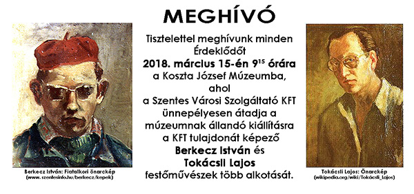 Festményátadó Tisztelettel meghívunk minden érdeklődőt 2018. március 15-én 9.15 órára a Koszta József Múzeumba, ahol a Szentes Városi Szolgáltató KFT ünnepélyesen átadja a múzeumnak állandó kiállításra a KFT tulajdonát képező Berkecz István és Tokácsli Lajos festőművészek több alkotását.