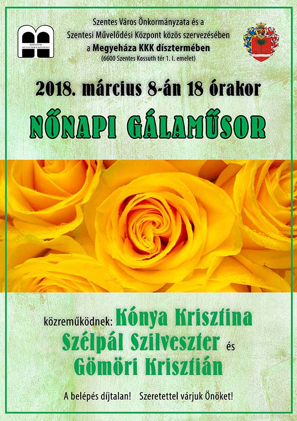 Nőnapi Gálaműsor Szentes Város Önkormányzata és a Szentesi Művelődési Központ közös szervezésében a Megyeháza Konferencia és Kulturális Központ dísztermében 2018. március 8-án 18:00 órakor Nőnapi Gálaműsort rendeznek. A műsorban közreműködik: Kónya Krisztina, Szélpál Szilveszter és Gömöri Krisztián. A belépés díjtalan, melyre minden érdeklődőt szeretettel várnak!