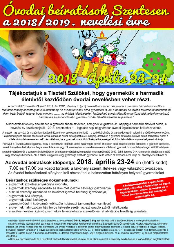 Óvodai beíratások Szentesen a A köznevelési törvény értelmében a gyermek abban az évben, amelynek augusztus 31. napjáig a harmadik életévét betölti, a nevelési év kezdő napjától – 2018. szeptember 1. - legalább napi négy órában óvodai foglalkozáson kell részt vennie.