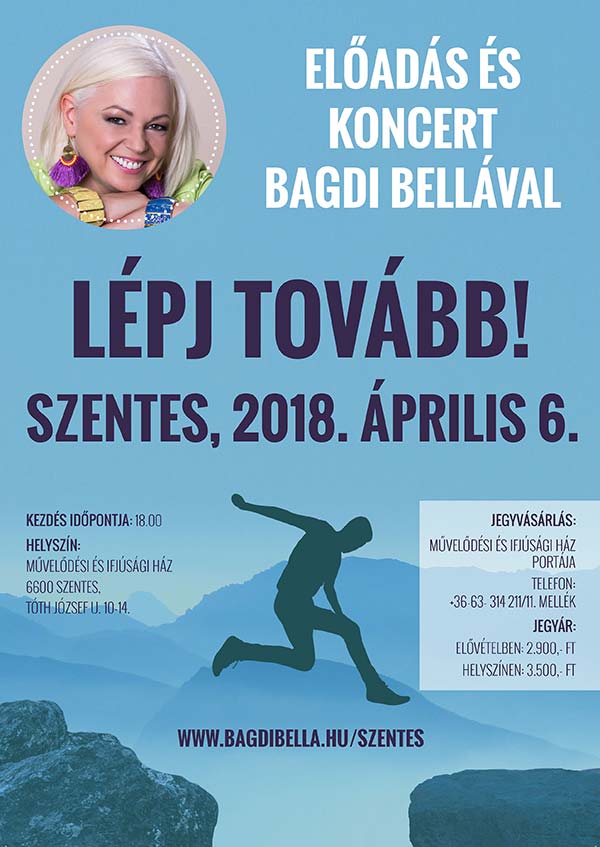 Bagdi Bella koncert Szentesen Lépj tovább! Sokan használják arra Bella zenéjét, hogy enyhítsék egy nehéz nap hatásait vagy csak feltöltődjenek lelkileg tőle. Bármelyen módon is hallgatsz, vagy énekelsz Bella dalokat, fejleszted önmagad. DE ÉLŐBEN ÁTÉLNI EGÉSZEN MÁS! Semmihez nem fogható az az élmény, amit Bella személyes jelenlétével adni tud a koncertjein. Ezen az estén különféle élethelyzetek, életszakaszok megoldásaihoz, problémáihoz kapunk olyan útmutatókat a zenén keresztül, amelyek segíthetnek bennünket egy adott helyzettel kapcsolatos pozitív elvárásainkat megerősíteni. Legyen szó akár célok eléréséről, elengedésről, gyógyulásról, bármiről, ami most fontos neked. Ezen az estén megtapasztalhatod, hogyan számíts arra, hogy a körülményeid a javadra változzanak. Aki látja maga előtt az utat, az új szintre emelkedhet!