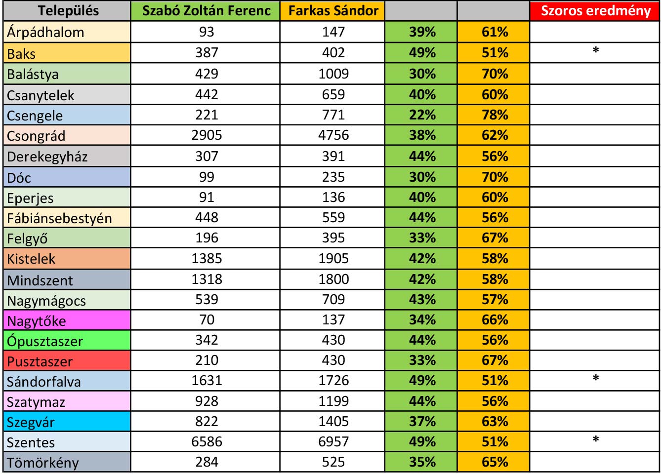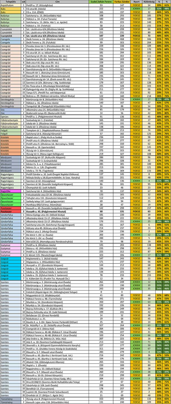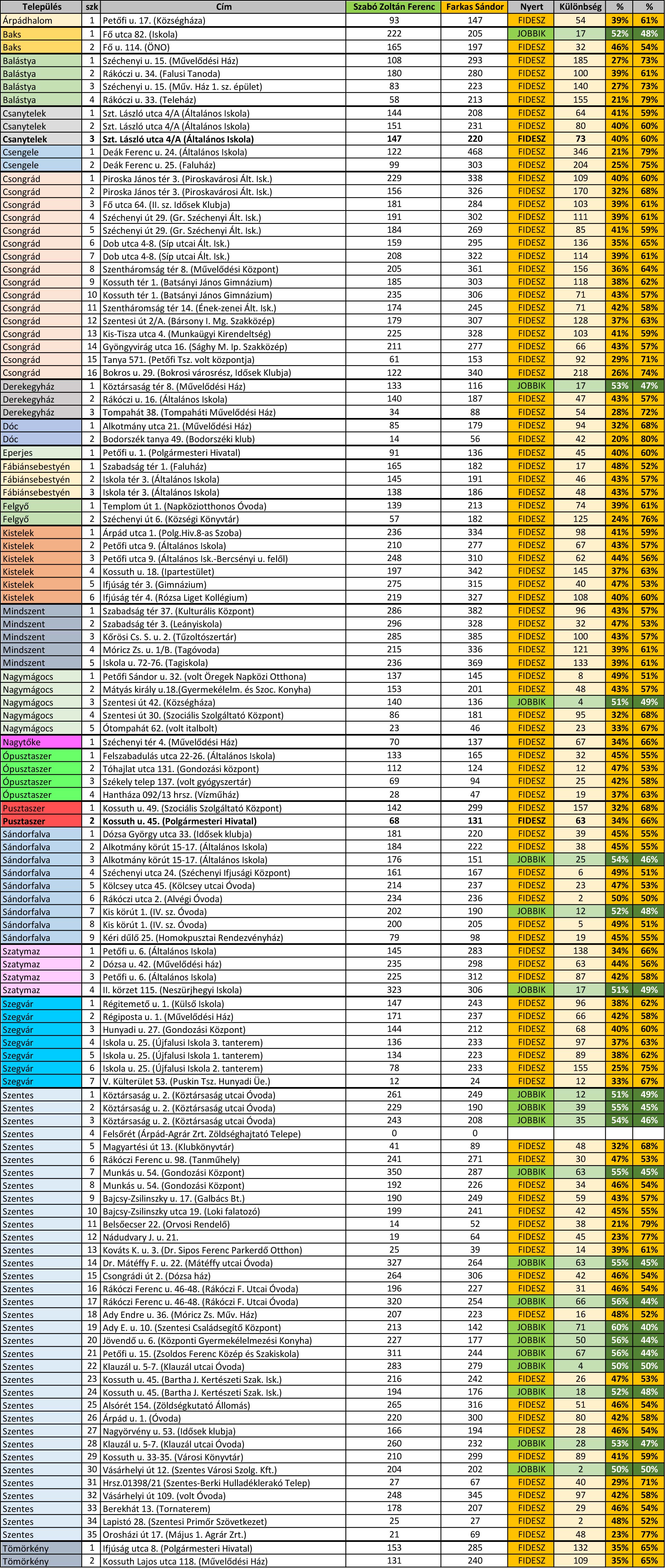 A tegnapi országgyűlési választás eredményét kielemeztük településre és szavazókörre lebontva. Az első két helyezett Farkas Sándorra és Szabó Zoltán Ferencre leadott voksokat összesítve látható, hogy a 3 sz. választókerületben minden településen a Fidesz jelöltje Farkas Sándor nyert. Szoros eredmény alakult ki Bakson, Sándorfalván és Szentesen. Szabóra a térségben 19733-an szavazta, míg Farkasra 26683 voks érkezett. Összesen 6950 szavazattöbbséggel választották meg a térség országgyűlési képviselőjének Farkas Sándort.