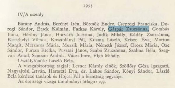 Gáspár Zsuzsanna 1934. augusztus 6-án született Szegeden. Az általános iskolát és a gimnázium első 3 évét szülővárosában végezte el, negyedikesként került Szentesre. 1953-ban érettségizett a HMG IV/A osztálya tanulójaként - amint az a HMG 1949-1970 közötti történetét összefoglaló évkönyvben olvasható.