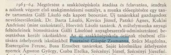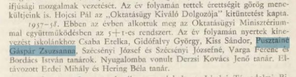 Pusztainé Gáspár Zsuzsanna az 1957-58-as tanévben egykori középiskolájához, a szentesi Horváth Mihály Gimnáziumhoz kapott tanári kinevezést, ahol 1963-ig tanította szaktárgyait.