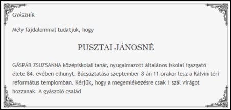 Pusztai Jánosné Gáspár Zsuzsanna (1934-2018) magyar-orosz szakos középiskolai tanár, nyugalmazott általános iskolai igazgató élete 84. évében elhunyt.