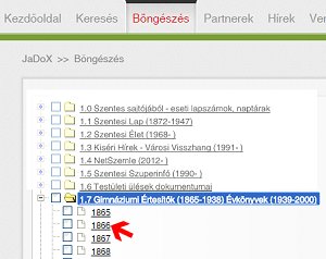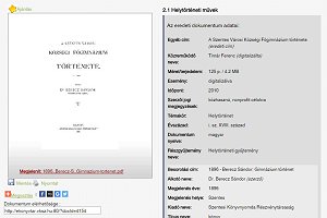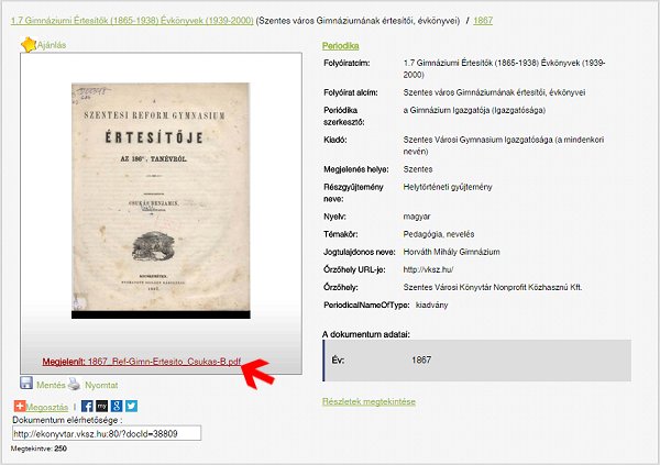 A gyűjteményhez sok helyről vezet célirányos webhivatkozás, ami közvetlenül felkínálja egy-egy konkrét gyűjteményrész vagy tartalom rekordját. A böngészőnk címsorába be is gépelhetjük: Ezen a címen nyílik a gyűjtemény főoldala. Fent a Böngészés menüpontra kattintva megjelenik a menü, felül a periodikákkal, lentebb a "szóló" monografikus dokumentumokkal. Itt az 1.7 Gimnáziumi Értesítők... sorra, majd a lenyíló listában a megjelenés évére kattintva megkapjuk a kötet rekordját, ahol a kapcsolódó információk olvashatók. Az első oldal bélyegképére kattintva az nagyobb méretben jelenik meg, maga a PDF-fájl pedig alatta a Megjelenít: ... linkre kattintva tölthető le - ez után pedig a gépünkön megszokott módon olvasható.