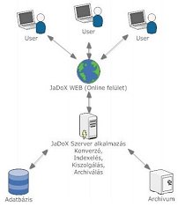 A JaDoX platform-független rendszer, amely nyílt forráskódú, ingyenes adatbázis-kezelő motorra épül. A később felmerült igények, a folyamatos fejlesztés nyomán mára teljes körű megoldást nyújt a digitális objektumok - szöveg, kép, hang és videófilm - feldolgozásához, tárolásához, megjelenítéséhez és visszakereshetőségéhez.