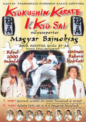 Április 27-28-án Szentesen rendezik meg az I. Kyo Sai-t ami egy Kyokushin Karate fesztivál, ami egyben egy súlycsoportos Magyar Bajnokság. Ezen a két napon 700 versenyző küzd egymás ellen. Április 27-én de. 10.00 órakor kezdődik a megnyitó ceremónia. Első nap öt küzdőtéren folynak a harcok, majd a döntők már három páston folynak. 27-én 16.00 órakor megemlékeznek a résztvevők a kyokushin karate alapítójáról, a Sportcsarnok előtt található shinto kapunál és emlékműnél. A Mozaikon folyamatosan tudósítunk a két nap eseményéről, tehát érdemes ezen a két napon többször klikkelni a Mozaikra. Szentes, 2002. 04. 23.