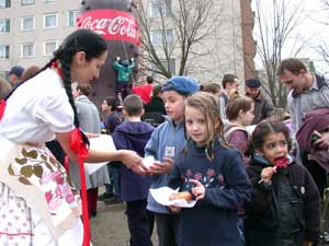 Délben közel ezer fánkot osztottak szét a népviseletbe öltözött lányok és fiúk. Igazi Szentesi fánk volt sok baracklekvárral.