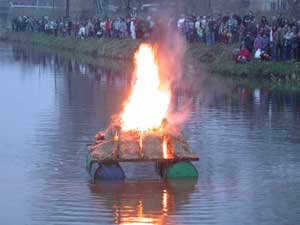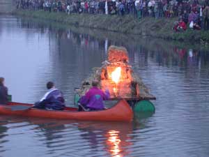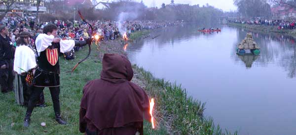 Ekkor jött a B (BÉ) TERV. Kenuról egy könnyed mozdulattal Valkay Zsolt gyújtotta meg a télűző máglyarakást.