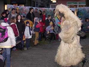 Utána kezdődött ám a riogatás! Sok gyerek kapta el apja lábát és bújtak el mögött, mert a busók derekára 5-6 db óriás kolomp volt rögzítve, amit twisztes mozdulattal szólaltattak meg.