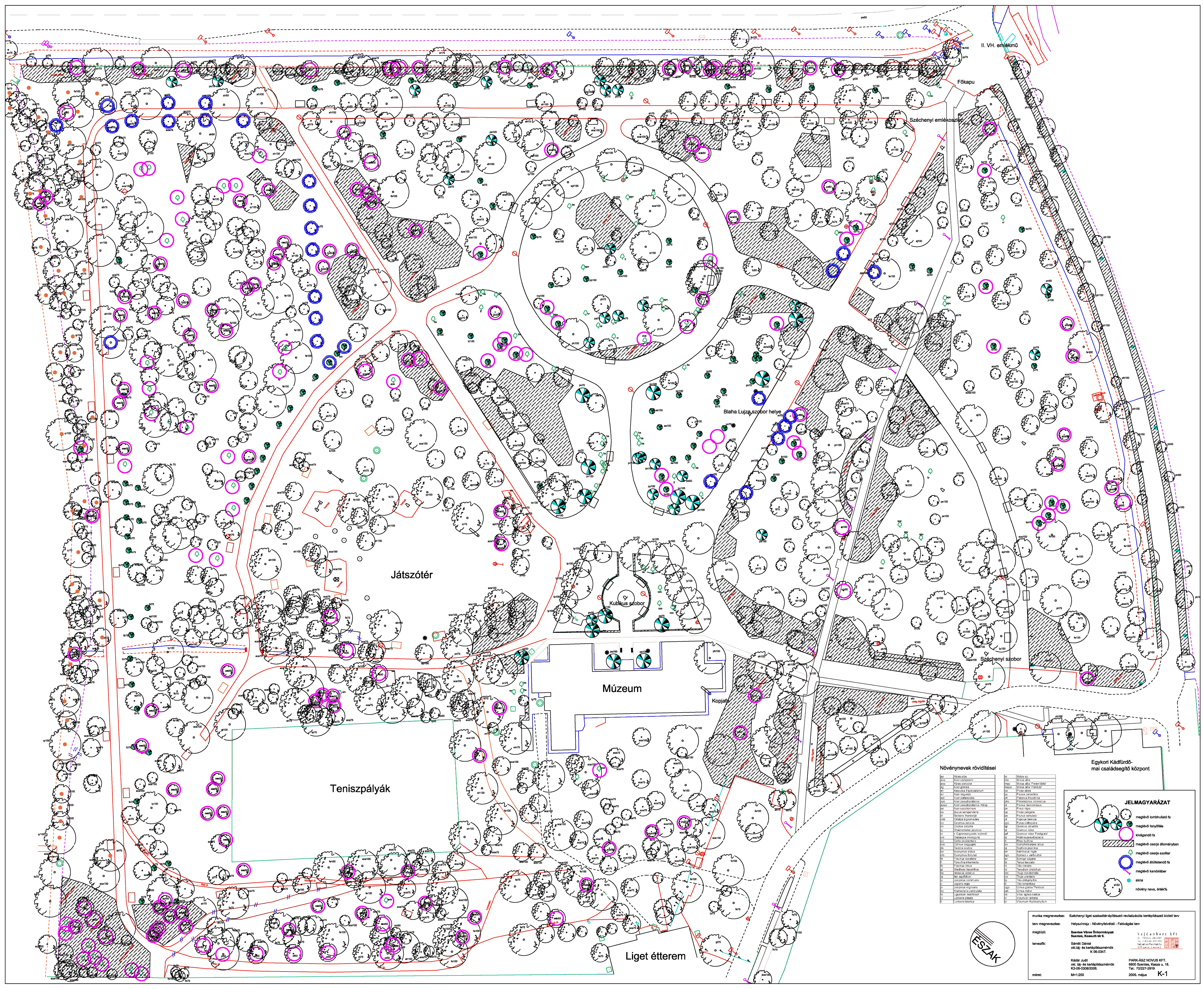 A mellékelt tervlap tartalmazza a kivágásra ítélt fákat (189 db). A helyszíni bejárás során a fákat megvizsgáltuk, az egészségi állapotfelmérésüket elvégeztük. Sok nagyméretű, idős fa jellemzi a területet, illetve nagyon sok a magról kelt fa, illetve a sarjfa. A fakivágásokat az egészségi állapot, a növénytársulásban betöltött nem megfelelő szerep (alászorult fa), illetve az esztétikai érték indokolja. A cserjeirtást olyan helyeken szükséges elvégezni, ahol a futópálya nyomvonala miatt feltétlen szükséges. Némely új telepítésű faegyed átültetését részben nem megfelelő faja, fajtája, részben pedig esztétikai értéke, „oda nem illősége” (a ligeti „hangulatnak, látványnak”, nem megfelelőek) indokolja (pl. Prunus cerasifera „Nigra’ fasor, Thuja occidentalis és Chamaecyparis lawsoniana fasor a játszótérhez közeli területen). Az átültetendő (a város más részére áttelepítendő) fákat is tartalmazza tervlap.