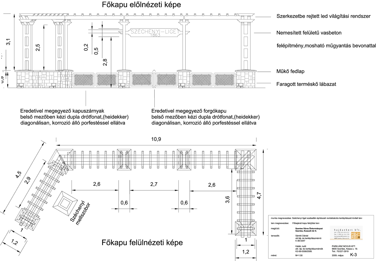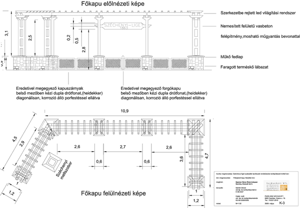 A ligetkapu felújítása kapcsán felmerült, hogy a múlt század elején felállított fakapu másával kellene leváltani a mostani vasbeton szerkezetet, de végül úgy döntöttek a tervezők, hogy csupán renoválják a mai bejáratot. A ligeti főbejárati kapu tervét is megtekinthetjük az alábbi tervlapon. A javaslat szerint vissza kellene állítani a pár évvel ezelőtti forgókapus megoldáshoz hasonló bejáratot. A kapu legfelső szelemenjébe LED világítási rendszert terveztek, a nemesített felületű vasbeton oszlopokat mosható műgyantás bevonattal látják el. Kinagyítható!