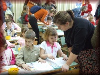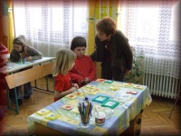 Zsuzsika néni Hodosán Vanesszának (3.b) segít |