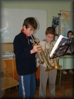 László Balázs és Miskolczi Máté (4.b) kedvenc hangszerükkel a tormbitával |