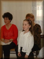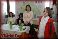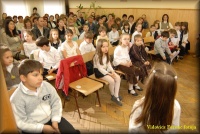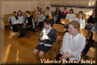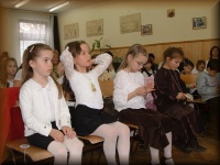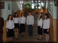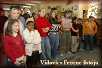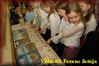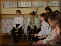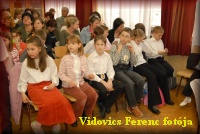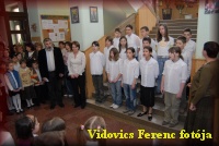 Március 22-én a megnyitón a 6.b osztályosok Kodály-biciniumokkal kedveskedtek a vendégeknek. |