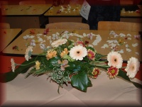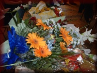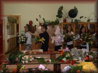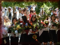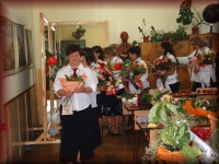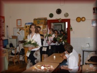 A 7. b osztályosok tarisznyát és virágot adnak a ballagóknak |