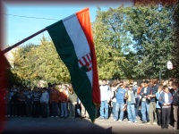 A nemzeti színű záűszló előtt...