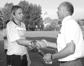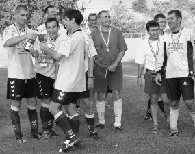 a csapatok.A fordulás után a vendégek is próbálkoztak, de Soós bravúrral mentett. A 74. percben eldőlt a mérkőzés, ekkor Tóth Cs. bólintott a karcagiak halójába, s állította be a 2:0-s végeredményt. A 2002-2003-as bajnoki idényt záró hármas sípszó után jött a pezsgőfürdő. Utolsó momentumként pedig átvették a megérdemelt aranyérmet. Íme