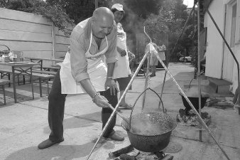 most marhalábszárból főztek a versenyzők. Ezúttal ugyan jóval kevesebben vettek részt, mint a tavalyi, első ízben megrendezett augusztus 20-i versengésen, de a mostani indulók mindegyike főzött akkor is, mondta Hegedűs István, az étterem tulajdonosa. A zsűri elnökeként ismét Ihos József tevékenykedett, s miután egy előműsorral bocsátotta útjára a versenyt, személye garancia volt a jó hangulatra. A népszerű humorista nem először járt városunkban, érdeklődésünkre elárulta: az étteremnek is gyakori vendége, jó kapcsolatban van a tulajdonossal. S, hogy miként került egy főzőverseny zsűrijébe? Meglepő kijelentéssel rukkolt elő: szégyelli, de Ihos Józsefként nem tud főzni, csak mint "Kató néni". Legismertebb kabarészereplőjének ugyanis szerdánként a Budapest TV-ben saját főzőműsora van, abban kotyvaszt a "férjének". Ihos József azt mondja, mostanában agglegényéletet él, s otthon nem szokott főzni, a kibicelés viszont jól megy neki, így gyűjti be a tudnivalókat a főzésről. Elméleti szakembernek, kóstolónak tartja magát, aki pontszámot is tud adni. A zsűri másik két tagjával, Szűts Rita élelmiszeripari szakmérnökkel és dr. Tóth Gyula vízilabdaedző-állatorvossal menet közben kóstolgatták a készülő ételeket, s mindent feljegyeztek, begyűjtötték a versenyző csapatok receptjeit is. Az egyik fortyogó kondér mellett Kurucz Márton megjegyezte, neki kötelező nyerni. Persze, hiszen tavaly is ő vitte el a pálmát. A különböző technológiák más-más ízhatást eredményeztek, a komoly szakmaiságot ezúttal félre tevő, és a szubjektivitást előtérbe helyező zsűri miként az ultiban, színekkel jelölte a helyezetteket. A piros, vagyis az első hely a tavalyi győztes vezetésével a Rókapa elnevezésű csapatnak jutott, fűszeres ízekkel érdemelték ki. Lassú tűzön kiváló ízanyagot hozott össze, s kapta a tökfilkót a Tűzoltóság csapata. A zöld lapot a Kinizsi 2000 Rt. csapatának adták, amúgy ők főztek a legpontosabban: délután 3 óráig volt a határidő, ők percre pontosan ekkorra készültek el. A Kedvencek Baráti Körének a makk, és a negyedik hely dukált aznap, de a zsűri szerint szívük-lelkük benne volt főztjükben. Bár csak férfiak neveztek a versenybe, az egésznek azért mégiscsak a nők voltak a tartópillérei, s a légkör a végére igazán családiassá vált: vidám asztaltársaságok fogyasztották el az elkészült ételeket. D. J. |