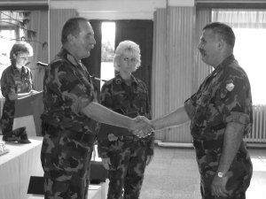István és Szabó István kézfogása az állománygyűlésen. Több időszerű pontja volt annak az állománygyűlésnek, melyet Kovács István dandártábornok, az MH 37. II. Rákóczi Ferenc Műszaki Dandár parancsnoka tartott augusztus 31-én a szentesi laktanyában. A parancsnok megköszönte dr. Padányi József mérnök-ezredes munkáját, aki megbízással egy éven keresztül látta el a dandárparancsnok-helyettesi beosztását. Az ezredes visszatért eredeti munkakörébe, a Zrínyi Miklós Nemzetvédelmi Egyetem tanári karába. Az alakulat parancsnok-helyettesi beosztását szeptember 1-jétől Szabó István mérnök-ezredes tölti be, aki az Amerikai Egyesült Államok Nemzetvédelmi Egyetem vezérkari tanfolyamának sikeres elvégzése után tért vissza korábbi beosztásába Szentesre. Kovács dandártábornok a szolgálati feladatok ellátása során végzett életmentésért és bátor helytállásért ezüstözött emlékérmet adott át a műszaki dandár állományából annak a hét főnek, akik augusztus 20-án kimentették a budapesti rendezvényen felborult kis hajó négy utasát. A beosztásaiban huzamosabb időn át nyújtott kiemelkedő munkája elismeréseként 50. születésnapja alkalmából a Magyar Köztársaság Honvédelmi Minisztere dísztőrt adományozott Nyers József alezredesnek, a műszaki dandár Hídépítő zászlóalj parancsnokának. Az állománygyűlésen bemutatták a katonai tanintézetekben idén végzett tíz tisztet és nyolc tiszthelyettest. Legtöbben közülük a Hídépítő zászlóalj állományában kezdik meg katonai pályafutásukat. A parancsnok az állománygyűlés utolsó pontjában megköszönte a személyi állománynak a közelmúltban kiemelkedően végzett munkát és ismertette az állománnyal a dandár előtt álló főbb feladatokat. Kép és szöveg: Palatinus András százados |