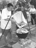 Vidovics)Rekordnevezés! Ez jellemezte Szentes immár hagyománnyá váló lecsófesztiválját. 2002-ben 36-an, 2003-ban 49-en, tavaly 77-en, most a lista szerint 117-en sorakoztak fel a főzéshez. Nagyon sok helyről eljöttek a hívó szóra. Ennek része volt az, hogy a MÁV vasutas nyugdíjasklub Szentesen tartotta országos összejövetelét, így ők is bekapcsolódtak a lecsófőzésbe is. Tíz helyet foglaltak. Ők azután az ország minden részéből (Tatabányától Mezőtúrig) színesítették a rendezvényt. Mindez szó szerint értendő, hiszen műsort adtak, és mint említettük, bográcsban is főztek. Mellettük találkozhattunk pécsiekkel, a fővárosból is többen jöttek. A Szentesről elszármazottak is nézelődtek. Aztán külföldről jöttek a finnek, mindjárt a Rákóczi utca elején 2–3 helyet foglaltak, de főztek amerikaiak, németek, újszentesiek. Dr. Horváth György zsűrielnök áttörésnek nevezte az eseményt. Mint mondta, amikor elindultak a szervezéssel, nehéz dolguk volt, szinte agitálni kellett a szentesieket, hogy jöjjenek ki az utcára. – Többen szabadkoztak. Mondtuk, az országban több helyen vannak hasonló rendezvények. Szinte személyes unszolásunkra, egy kicsit talán unottan is, de kijöttek főzni az Apponyi térre. Mára elértük azt, hogy előre szóltak, jövőre ugyanoda, volt, aki kettő helyet kért. Már nem kényszer, érdemes eljönni. Ne csak a tévét nézzük otthon, jöjjenek ki, beszélgessünk. Én is belebotlottam olyan ismerősbe, akivel most és itt találkoztam. Jól esett. Nagyon sok gyereket lehetett látni. Jól megfogalmazta Mészáros Zoltán, a rendező Hunor Coop Rt. elnök-vezérigazgatója, hogy családi program legyen. Százhúsz bogrács lecsó A délelőtt a gyerekeké volt, színpadon és a rendezvény színhelyén egyaránt. A színpadon egymást váltották a gyermek- és művészeti csoportok a szülők legnagyobb örömére. Többek között a Damjanich utcai óvodások, a Petőfi Sándor Általános Iskola tanulói adtak műsort, a többiek a Köztársaság utcai Óvoda szervezésében kézműves sátrakban szórakozhattak. Volt arc- és üvegfestés, batyubábok készítése, mézeskalácssütés. Az élő lecsó-csocsó bajnokságon a reggeli óráktól rúgták a bőrt a fiatalok. A Pengető citerazenekar muzsikáján a lecsófőzők ráhangolódtak a versenyre, elkezdődtek az előkészületek. A csapatok hozzá kezdtek a lecsóhoz való hagyma, paprika és paradicsom pucolásához. Délután 3 órakor, ágyúdördülésre a résztvevők meggyújtották a farakásokat, és kezdődhetett a lecsófőzés. Milyen