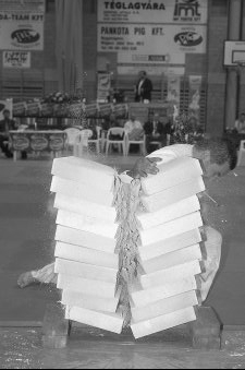 Sándor bemutatójaPár éve a kyokushin karate súlycsoport nélküli bajnokságait rendezte sensei Brezovai Sándor, a Magyar Tradícionális Kyokushin Karate Szövetség elnöke a szentesi sportcsarnokban. Az október 7-én sorra került magyar bajnokság az eddigiektől csak abban különbözött, hogy itt hét súlycsoportban (a nők háromban, a férfiak négyben) mérték össze tudásukat a legkiválóbb hazai versenyzők. A bajnokság a knock-down szabályrendszerben zajlott, melynek lényegét az angol kifejezés jelentése (leütni) megmagyarázza. Ez a verseny - melyet a Sport1 is felvett - a Magyar Karate Szakszövetség hivatalos, a sporttörvény által elfogadott magyar bajnoksága, vagyis az ország top-versenye, 80 versenyzővel. Megjelent rajta a négy szövetség, az egész napos verseny délutánján közösen adóztak a stílusalapító sosai Oya-ma emlékének. A sportcsarnok előtti emlékhelynél - mely a világon második - dr. Mészáros János, a karate szakszövetség elnöke utalt arra, hogy éppen a verseny napján, 50 éve indult a kyoku-shin karate története. A csarnokban megemlékeztek az Oyama-karate másik jubileumáról is, hazánkban 30 éve alapított dojo-t (edzőtermet) shihan Adámy István, aki ma a legnagyobb fokozatú mester idehaza. Shihan Furkó Kálmán is az alapítók közé tartozik, de a két mester és utóbbi legjobb tanítványa, shihan Borza József között a kyokushin három részre, önálló szakágakra bomlásával az elmúlt tíz évben nem volt éppen felhőtlen a viszony. Azonban az eddig haragban álló vezetők erre a napra szóba álltak egymással, és ez sensei Brezovai érdeme, aki eddig végzett munkájukat köszönve megajándékozta őket egy-egy virággal. Ennek a növénynek az a különlegessége, hogy ötven év múlva virágzik, szimbolizálva az együtt töltött időt, és a jövőt. Brezovai azt nyilatkozta, nem volt egyszerű a korábbi ellenlábasokat összehozni. A délelőtti selejtezők után még állva maradt versenyzők törésekkel folytatták a bajnokságot. Ököllel, kézéllel, könyökkel és lábbal aprították a deszkalapokat. Szerencse, hogy a sensei jó sok deszkát hozatott, mert azok már a könnyűsúlyúaknál is szépen fogytak (akadtak, akik 6-7 lapot is törtek egyszerre). A kihívások küzdelmét is megrendezték, a one much fight során a szentesi Oyama Dojo három ifjú reménysége kihívott egy-egy riválist. Fűtötte a visszavágás lehetősége a tizenéves fiúkat, akik nem sajnálták az egész nyarat a felkészülésre áldozni. Szívvel-lélekkel küzdöttek mindhárman. Forgó Tamás ellenfele a meccs elején megsérült, így az előző nap még lázzal is küzdő szentesi kisfiú gyors győzelemnek örülhetett, s mehetett pihenni. Kiss Elek Gergő majd Brezovai Botond is végig küzdötték a 3x1 percet, utóbbi 12 kg-mal volt könnyebb ellenfelénél, így került ki győztesen az egyébként döntetlenre végződött mérkőzésből. Botond apja, Brezovai sensei országos hírű bemutatójában betonlapokat tört, homlokkal például nyolcat zúzott szét. Utána a felnőttek küzdelmeit rendezték meg, melynek során volt minden, ami kyokushin tornán előfordulhat: gyors győzelem, kétszeri hosszabbítás, sérülés, óriási küzdőszellem. A nők +65 kg-os kategóriáját a hatszoros Európa-bajnok Szövetes Veronika nyerte. A győztesekre tekintélyes méretű kupák vártak. D. J. |
