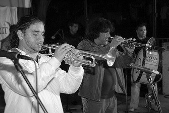 Marco és Boban Markovic az esti rendezvényenAmikor a semmiből hirtelen kiadós vihar támadt múlt csütörtök délután, a népzenei sokadalomra kilátogató közönség és a szervezők is azt hitték: na, ezt fújhatjuk, mármint, hogy az eső minden április 30-i ünnepi programot elmos, a topolyai Cirkalom Néptáncegyüttestől egészen Boban Markovic zenekaráig. A szintén aznapra tervezett szerb-magyar diplomáciai csúcs politikai okokból hiúsult meg, a kulturális műsor és a sportmérkőzések egy részének az eső megkegyelmezett. Bár a szervezők az időjárás-előrejelzésben hallottak alapján nem készültek "B-tervvel", a népzenei műsor a szerb-magyar barátság jegyében úgy egyórás kényszerszünet után folytatódhatott a Luther-téren. Igaz, a táncosok az esőáztatta színpadon már nem vállalták a fellépést, azért a sötétedésre ismét összeverődő tömeget a délszláv hagyományokat ápoló Kolo együttes jól szórakoztatta zenéjével.